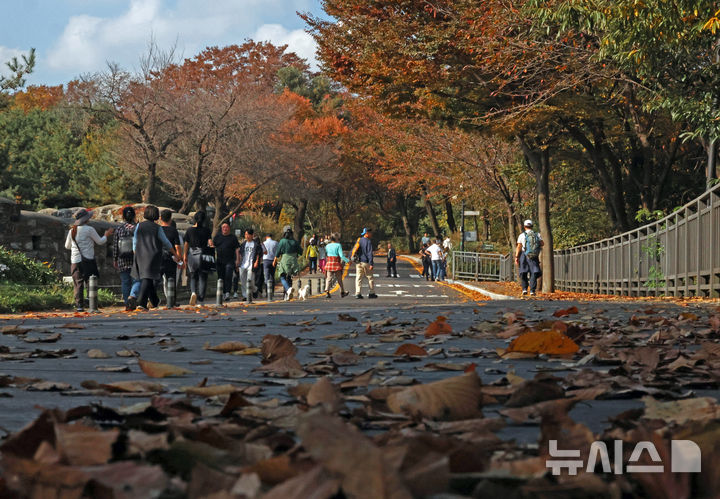 [서울=뉴시스] 김금보 기자 = 3일 서울 중구 남산이 단풍으로 물들어 있다. 2024.11.03. [email protected]