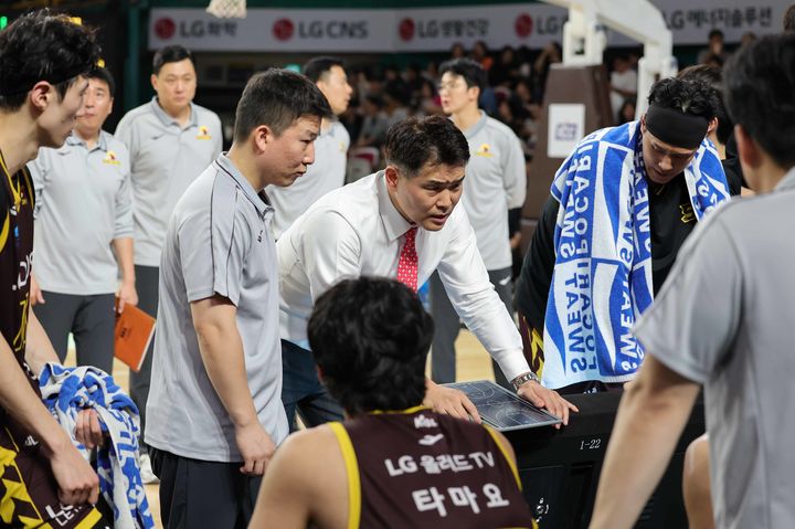 [서울=뉴시스] 고범준 기자 = 3일 경남 창원체육관에서 열린 2024-2025 KCC 프로농구 창원 LG 세이커스와 울산 현대모비스 피버스 경기, 쌍둥이 형제인 형 조상현 LG 감독이 선수들에게 작전 지시를 하고 있다. (사진=KBL 제공) 2024.11.03. [email protected] *재판매 및 DB 금지