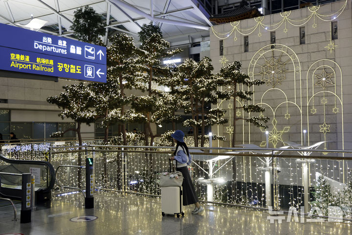 [인천공항=뉴시스] 최동준 기자 = 3일 인천국제공항 제1여객터미널 중앙 밀레니엄홀에 연말연시 맞이 겨울 조명 장식이 설치돼 있다. 2024.11.03. [email protected]