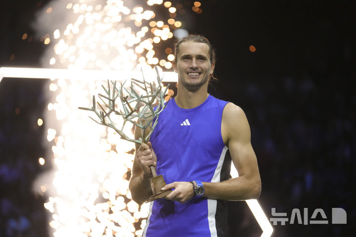 [파리=AP/뉴시스] 알렉산더 즈베레프(3위·독일)가 3일(현지시각) 프랑스 파리의 아코르 아레나에서 열린 2024 남자프로테니스(ATP) 투어 파리 마스터스(ATP 1000) 정상에 올라 트로피를 들고 포즈를 취하고 있다. 즈베레프는 결승전에서 우고 움베르(18위·프랑스)를 2-0(6-2 6-2)으로 물리치고 올해 두 번째 우승컵을 들어 올렸다. 2024.11.04.