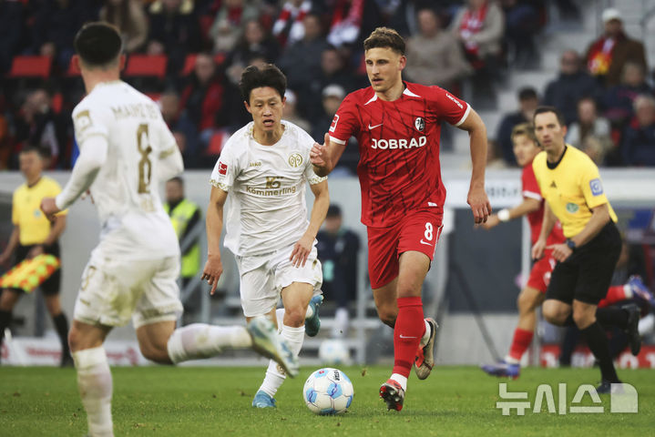 [프라이부르크=AP/뉴시스] 마인츠의 이재성(왼쪽)이 3일(현지시각) 독일 프라이부르크의 유로파파크 슈타디온에서 열린 2024-25시즌 분데스리가 9라운드 SC 프라이부르크와 경기 중 공을 다투고 있다. 이재성은 풀타임을, 홍현석은 후반 교체 투입돼 16분을 소화했으며 마인츠는 0-0 무승부를 기록했다. 2024.11.04.