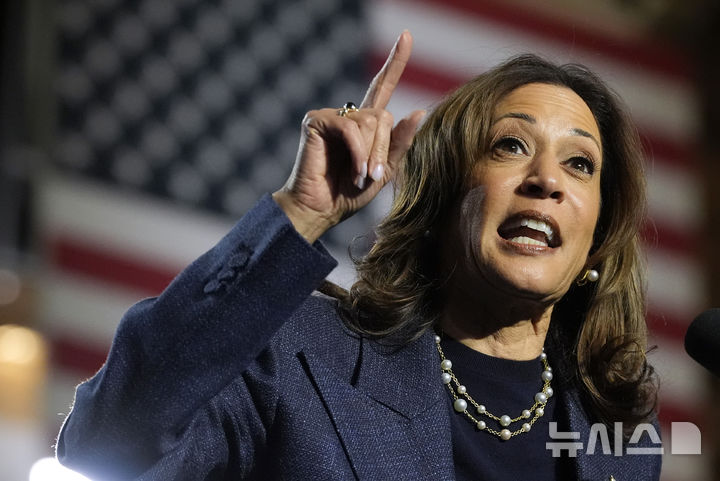 [이스트랜싱=AP/뉴시스] 미국 민주당 대선후보인 카멀라 해리스 부통령이 3일(현지시각) 미시간주 이스트랜싱 소재 미시간주립대 캠퍼스에서 연설하고 있다. 미시간주는 대선 경합주 중 한 곳이다.