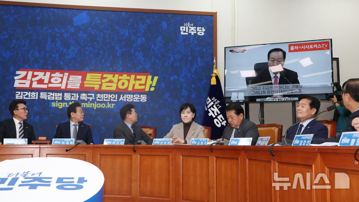 [서울=뉴시스] 고승민 기자 = 이재명 더불어민주당 대표 등 지도부가 4일 서울 여의도 국회에서 열린 최고위원회의에서 김병주 최고위원이 준비한 한기호 국민의힘 의원의 과거 발언 영상을 시청하고 있다. 2024.11.04. [email protected]