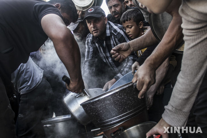 [가자시티=신화/뉴시스] 4일(현지시각) 가자지구 가자시티에서 어린이를 비롯한 팔레스타인 주민들이 식량 배급을 받고 있다. 세계보건기구(WHO), 유엔아동기금(UNICEF), 국제이주기구(IOM), 세계식량계획(WFP) 등 15개 유엔 기구와 구호 단체 수장은 공동 성명에 서명하고 "가자지구 북부 전역에 있는 팔레스타인 주민들은 질병·기아·폭력으로 목숨을 잃을 처지에 놓여 있다"라고 밝혔다. 2024.11.05.