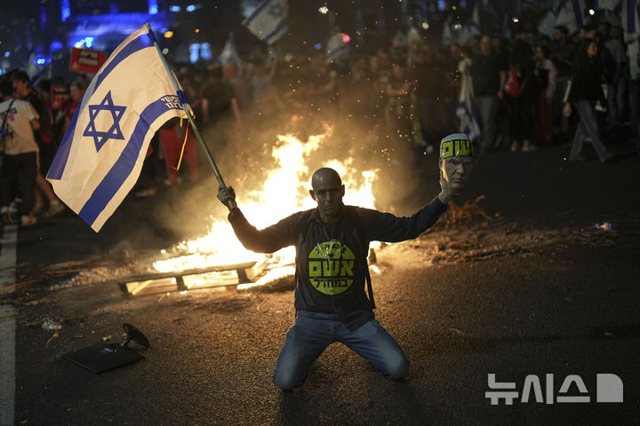 [텔아비브=AP/뉴시스] 5일(현지시각) 이스라엘 텔아비브에서 시위대가 베냐민 네타냐후 총리의 요아브 갈란트 국방장관 해임에 항의하며 도로를 차단하고 시위하고 있다. 앞서 네타냐후 총리는 "전쟁 중에는 총리와 국방장관 사이에 완전한 신뢰가 필요하다"라면서 신뢰가 깨진 갈란트 장관을 해임하고 이스라엘 카츠 외무장관을 후임으로 임명한다고 발표했다. 2024.11.06.