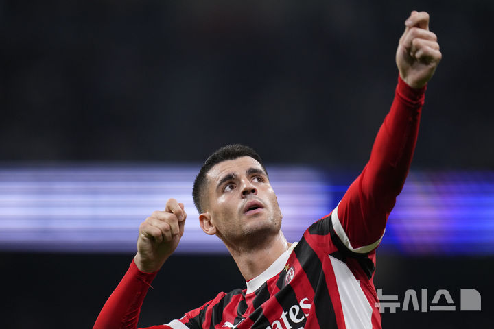 [마드리드=AP/뉴시스] AC 밀란의 알바로 모라타가 5일(현지시각) 스페인 마드리드의 산티아고 베르나베우 경기장에서 열린 2024-25시즌 유럽축구연맹(UEFA) 챔피언스리그(UCL) 리그 페이즈 4차전 레알 마드리드와의 경기 전반 39분 팀의 두 번째 골을 넣은 후 세리머니하고 있다. AC 밀란이 레알 마드리드를 3-1로 물리치고 2승2패(승점6)로 UCL 18위를 기록했다. 2024.11.06.