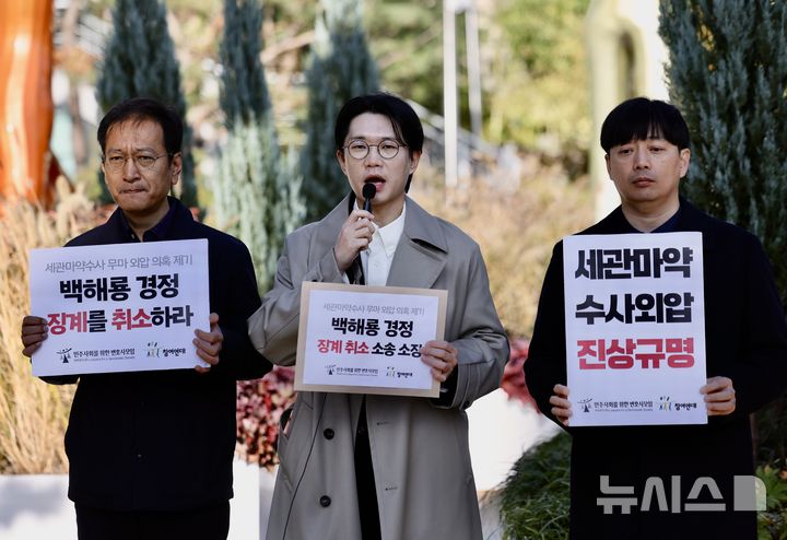 [서울=뉴시스] 김명년 기자 = 6일 오전 서울 서초구 서울행정법원 앞에서 열린 백해룡 경정 징계처분 취소소송 기자브리핑에서 법률대리인인 이창민 변호사가 발언하고 있다. 2024.11.06. [email protected]