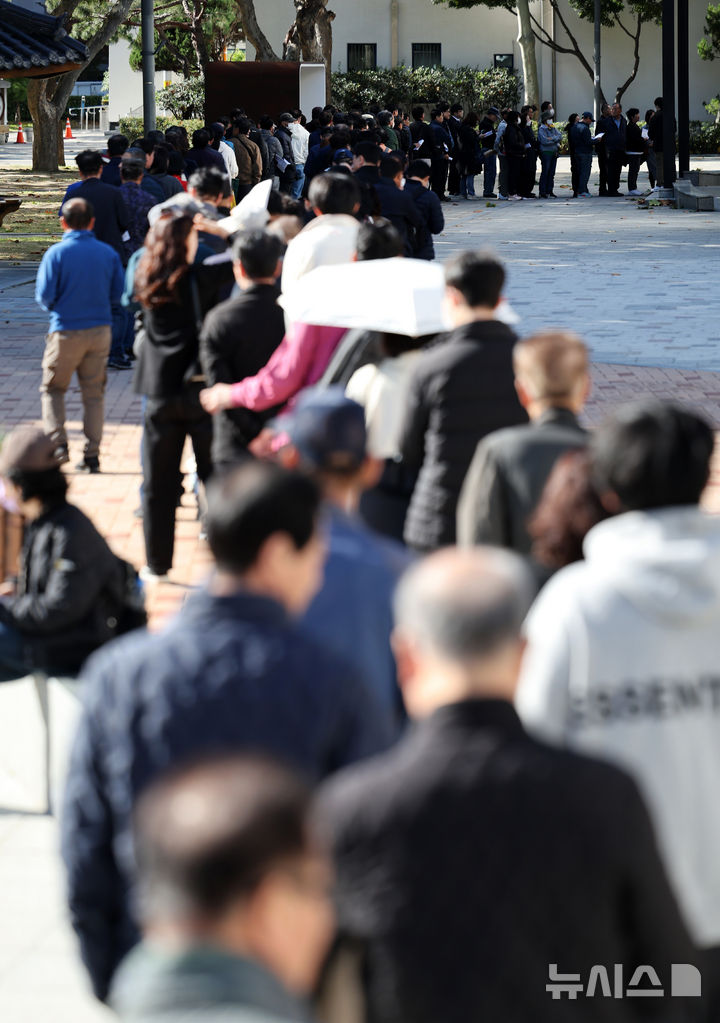 [대구=뉴시스] 이무열 기자 = 6일 대구 북구 대구복합스포츠타운 시민체육관에서 열린 ‘2024 행복 북구 구인·구직 만남의 날’을 찾은 구직자들이 입장을 위해 줄 서 있다. 2024.10.06. [email protected]