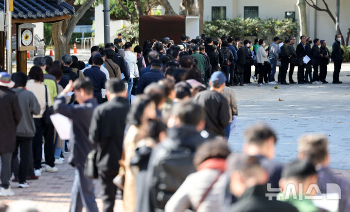 [대구=뉴시스] 이무열 기자 = 6일 대구 북구 대구복합스포츠타운 시민체육관에서 열린 ‘2024 행복 북구 구인·구직 만남의 날’을 찾은 구직자들이 입장을 위해 줄 서 있다. 2024.10.06. [email protected]