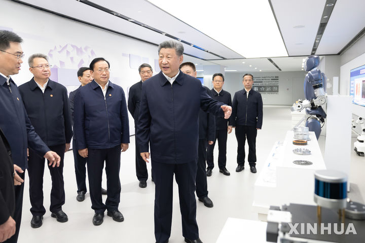 [우한=신화/뉴시스] 시진핑 중국 국가주석이 지난 5일(현지시각) 중국 후베이성 우한의 우한산업혁신발전연구소를 방문해 둘러보고 있다. 시 주석은 지난 5일부터 3일간 후베이성을 시찰했다. 2024.11.07.