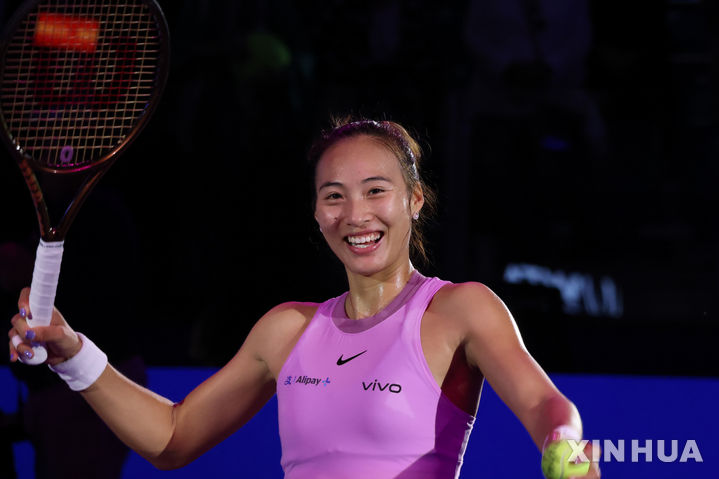 [리야드=신화/뉴시스] 정친원(7위·중국)이 6일(현지시각) 사우디 리야드에서 열린 2024 여자프로테니스(WTA) 투어 파이널스 퍼플그룹 조별 예선 3차전에서 자스민 파올리니(4위·이탈리아)를 물리치고 환호하고 있다. 정친원이 2-0(6-1 6-1)으로 승리하고 2승1패로 준결승에 올랐다. 2024.11.07.