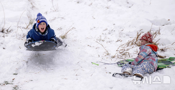 [콜로라도스프링스=AP/뉴시스] 6일(현지시각) 미 콜로라도주 콜로라도스프링스의 모뉴먼트 밸리 파크에서 친구 사이인 엘리자베스 라슨(10)과 헨리 존스(12)가 눈썰매를 타고 있다. 이 지역에 몰아친 눈폭풍으로 콜로라도스프링스 곳곳에 최대 30㎝ 이상의 눈이 내렸다. 2024.11.07.