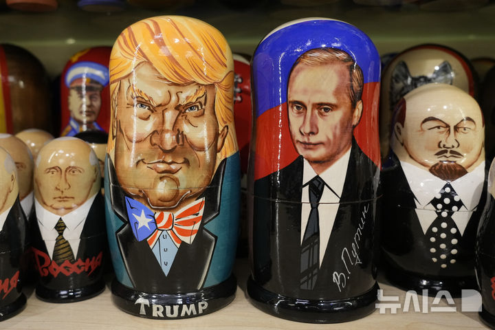 [상트페테르부르크=AP/뉴시스] 6일(현지시각) 러시아 상트페테르부르크의 한 기념품 가게에서 도널드 트럼프 미국 대통령 당선인과 블라디미르 푸틴 대통령을 묘사한 러시아 전통 목조 인형 마트료시카가 판매되고 있다. 2024.11.07.