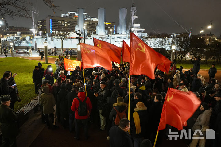 [상트페테르부르크=AP/뉴시스] 7일(현지시각) 러시아 상트페테르부르크에서 공산당 지지자들이 볼셰비키 혁명 107주년을 기념하기 위해 아브로라 순양함 주변에 모여 있다. 아브로라 순양함은 1917년 11월 7일(당시 러시아력 10월 25일) 공포탄을 발사해 혁명의 시작을 알렸다. 2024.11.08.