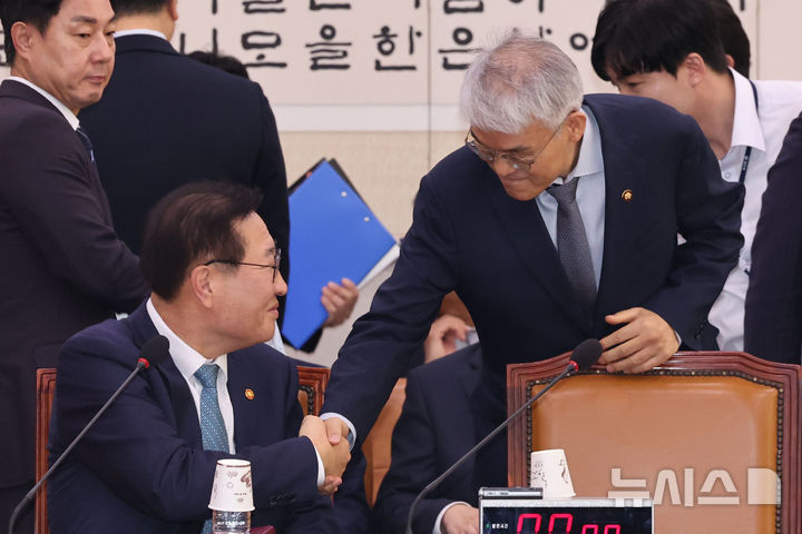 [서울=뉴시스] 권창회 기자 = 박성재 법무부장관과 천대엽 법원행정처장이 8일 오전 서울 여의도 국회에서 열린 법제사법위원회 전체회의에서 악수하고 있다. 2024.11.08. [email protected]
