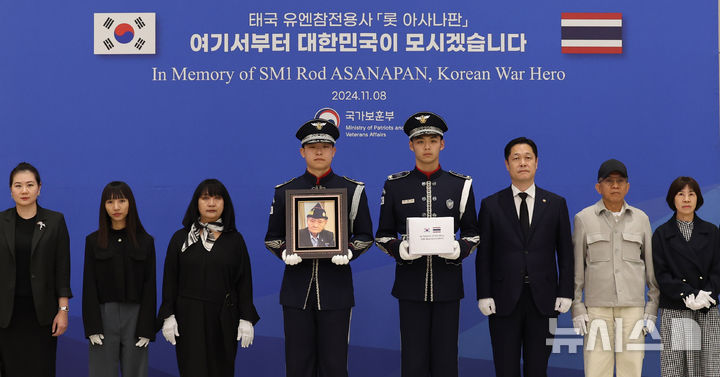 [인천공항=뉴시스] 추상철 기자 = 이희완(왼쪽 여섯번째) 국가보훈부 차관이 8일 오후 인천국제공항 제2터미널에서 열린 태국 유엔참전용사 '롯 아사나판' 유해 봉환식에서 유가족과 함께 기념촬영을 하고 있다. 2024.11.08. [email protected]