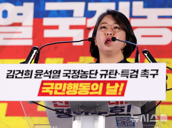 [서울=뉴시스] 이영환 기자 = 용혜인 기본소득당 대표가 9일 서울 세종대로에서 더불어민주당이 주최한 제2차 김건희 윤석열 국정농단 규탄·특검 촉구 국민행동의 날!에서 발언을 하고 있다. 2024.11.09. [email protected]