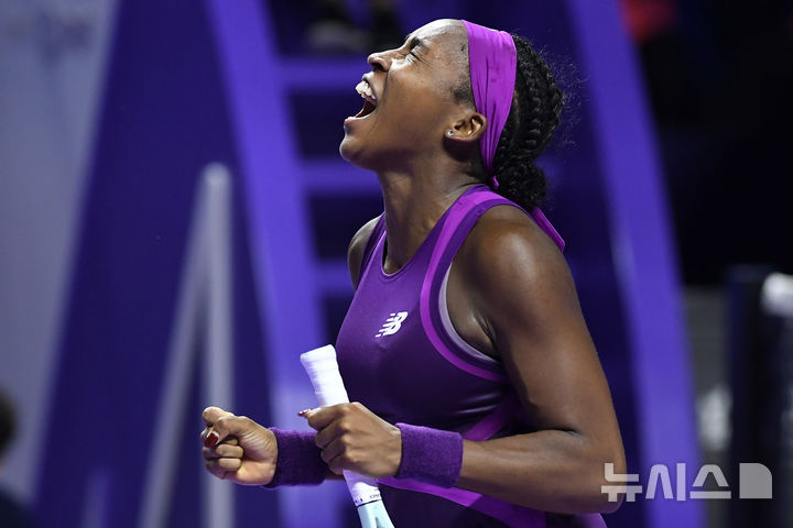 [리야드=AP/뉴시스] 코코 고프(3위·미국)가 9일(현지시각) 사우디 리야드에서 열린 2024 여자프로테니스(WTA) 투어 파이널스 결승전에서 정친원(7위·중국)에게 2-1(3-6 6-4 7-6) 역전승을 거두고 우승하며 환호하고 있다. 고프는 마리야 샤라포바(러시아) 이후 20년 만에 이 대회 최연소 우승자가 됐다. 2024.11.10.