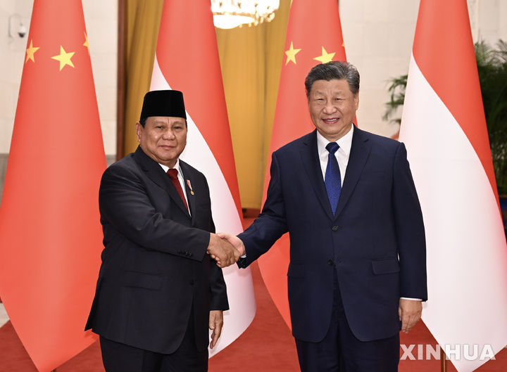 [베이징=신화/뉴시스] 시진핑(오른쪽) 중국 국가주석이 9일 중국 베이징의 인민대회당에서 프라보워 수비안토 인도네시아 대통령과 악수하고 있다. 수비안토 대통령은 취임 후 첫 해외 방문지로 중국을 방문했다. 2024.11.10.