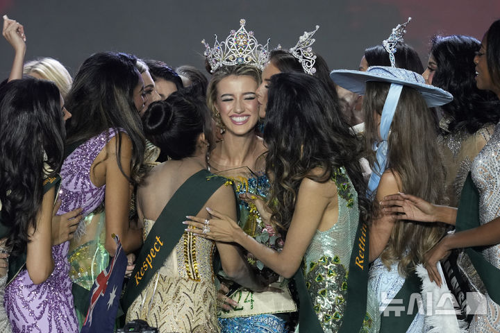 [파라냐케=AP/뉴시스] 9일(현지시각) 필리핀 파라냐케의 한 호텔에서 열린 2024 미스 어스 선발대회에서 '미스 어스'에 선정된 제시카 레인(호주, 가운데)이 다른 참가자들로부터 축하받고 있다. 2001년 시작된 '미스 어스'는 필리핀에서 열리는 세계 4대 미인대회 중 하나다. 2024.11.10.