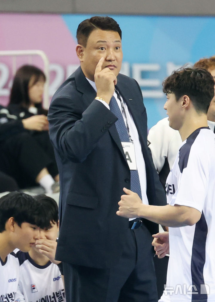 [서울=뉴시스] 김진아 기자 = 10일 오후 서울 송파구 올림픽핸드볼경기장에서 열린 신한SOL페이 2024-2025 핸드볼 H리그 개막전 두산과 하남시청 경기, 두산 윤경신 감독이 작전을 지시하고 있다. 2024.11.10. [email protected]