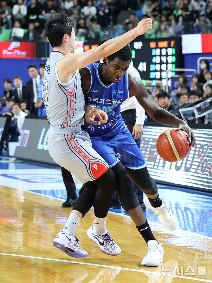 [대구=뉴시스] 이무열 기자 = 10일 대구 북구 대구체육관에서 열린 2024-2025 KCC 프로농구 정규리그 대구 한국가스공사 페가수스와 울산 현대모비스 피버스의 경기, 한국가스공사 니콜슨이 돌파를 시도하고 있다. 2024.11.10. [email protected]