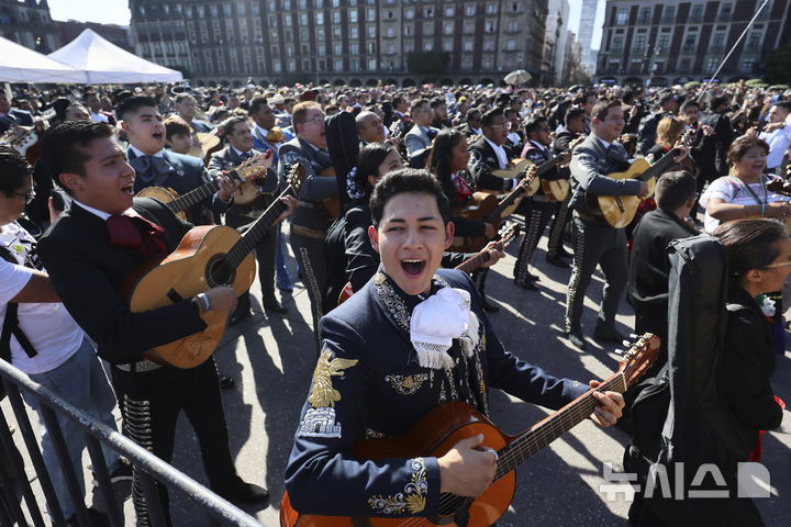 [멕시코시티=AP/뉴시스] 10일(현지시각) 멕시코 수도 멕시코시티의 소칼로 광장에서 '최다 마리아치 연주' 기네스 기록 도전자들이 악기를 연주하고 있다. '마리아치'는 멕시코의 전통 음악이자 밴드 형태를 의미하며 기타, 바이올린, 트럼펫 등의 악기로 구성된다. 이날 1천 명이 넘는 연주자가 모여 기존 700명의 기록을 깼지만, 기네스 측은 아직 공식 신기록 여부는 공표하지 않은 것으로 알려졌다. 2024.11.11.