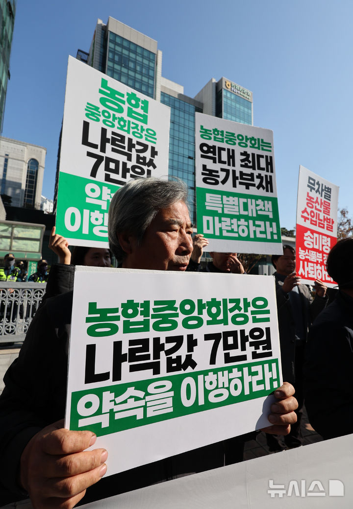 [서울=뉴시스] 황준선 기자 = 전국농민회총연맹 회원들이 11일 농업인의 날 행사가 열리는 서울 중구 농협중항회 인근에서 농림축산식품부 장관 사퇴 촉구 및 농업인의 날 행사 규탄대회를 하고 있다. 2024.11.11. [email protected]