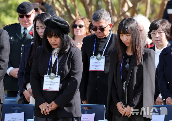 [부산=뉴시스] 하경민 기자 = 6·25전쟁 태국 참전용사 고(故) 롯 아싸나판씨 사후 안장식이 열린 11일 부산 남구 유엔기념공원에서 유가족 등이 고인에 대한 묵념을 하고 있다.
