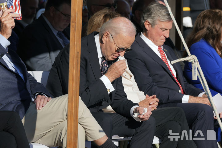 [클레이몬트=AP/뉴시스] 조 바이든 미국 대통령이 11일(현지시각) 재향군인의 날을 맞아 델라웨어주 클레이몬트의 그럽-워스 맨션에서 열린 장남 조셉 로비네트 바이든 3세(보 바이든) 소령의 명판 공개식에 참석해 고개를 숙이며 아들을 기리고 있다. 보 바이든은 델라웨어주 방위군 육군 장교로 근무하며 이라크 전쟁에 참전해 무공훈장을 받은 바 있다. 그는 주 법무장관까지 지내며 법 집행과 공공 서비스에 헌신해 많은 존경을 받았으나, 2015년 뇌종양으로 46세의 나이에 세상을 떠났다. 2024.11.12.