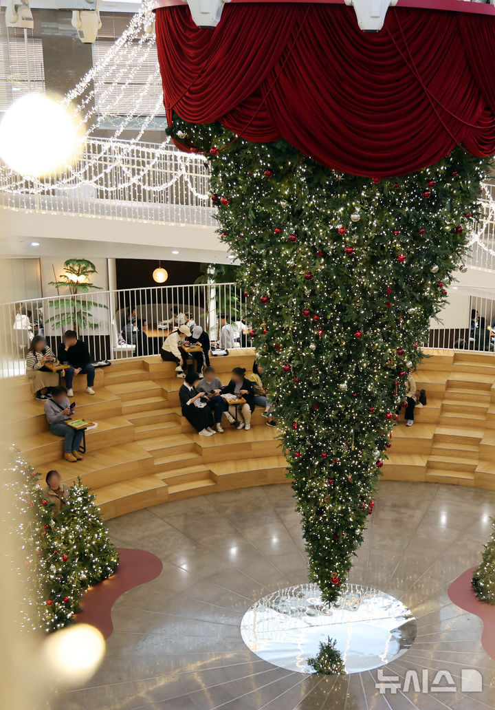 [부산=뉴시스] 하경민 기자 = 12일 부산 부산진구 롯데백화점 부산본점 9층 엘아레나 광장에 높이 7m 크기의 대형 '거꾸로 트리'가 설치돼 시민들의 눈길을 사로잡고 있다.