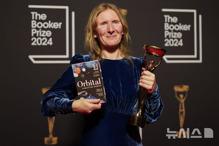 [런던=AP/뉴시스] 영국 소설가 사만사 하비가 12일(현지시각) 런던에서 2024 부커상을 받은 후 본인의 작품과 트로피를 들고 포즈를 취하고 있다. 하비는 국제우주정거장과 우주인 6명의 이야기를 다룬 소설 '오비털(Orbital·우주궤도)로 올해의 부커상을 받았다. 2024.11.13.