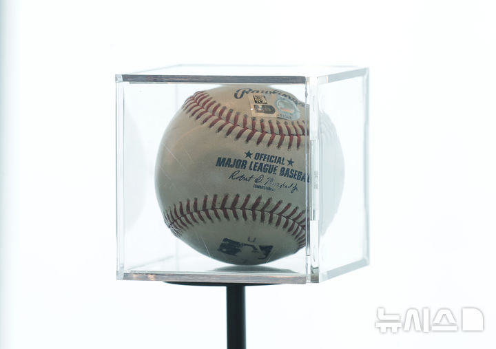 [타이베이=AP/뉴시스] 미국 프로야구 LA 다저스 오타니 쇼헤이의 50호 홈런공이 13일(현지시각) 대만 타이베이의 101 전망대에서 전시되고 있다. 이 공은 대만의 한 기업이 439만 달러(약 62억 원)에 낙찰받은 바 있다. 2024.11.13.