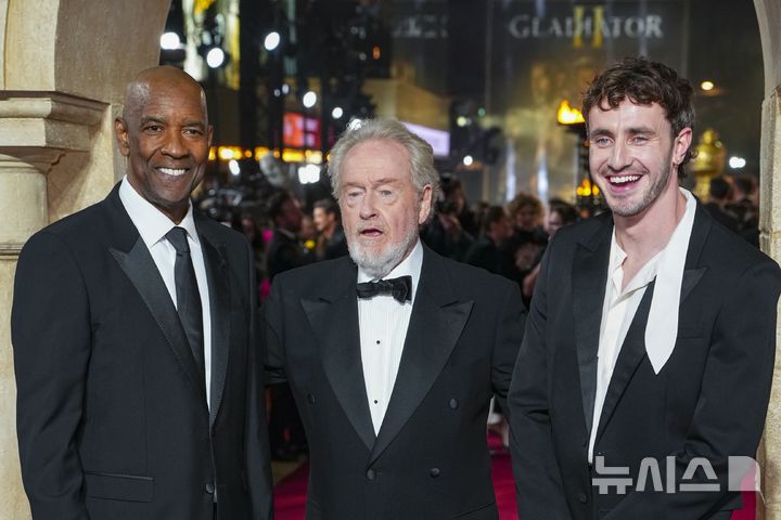 [런던=AP/뉴시스] 리들리 스콧(가운데) 감독이 13일(현지시각) 영국 런던에서 열린 영화 '글래디에이터2' 시사회장에 도착해 배우 덴젤 워싱턴(왼쪽), 폴 메스컬과 포토 타임을 갖고 있다. 2024.11.14.