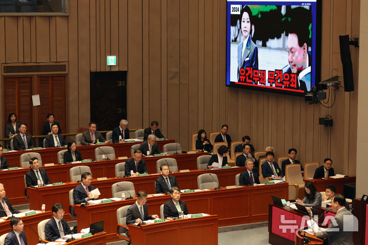 [서울=뉴시스] 조성우 기자 = 14일 오전 서울 여의도 국회에서 열린 예산결산특별위원회 전체회의에서 이재강 더불어민주당 의원이 김민기 국회 사무총장에게 국회방송의 자료화면 방송 송출 관련 질문을 하고 있다. 2024.11.14. [email protected]