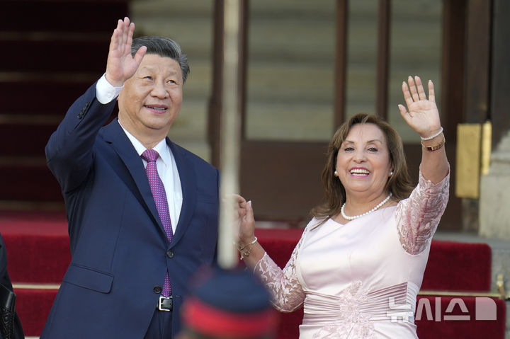 [리마=AP/뉴시스] 시진핑(왼쪽) 중국 국가주석이 14일(현지시각) 페루 리마 정부 청사에서 열린 환영식에 참석해 디나 볼루아르테 페루 대통령과 함께 손을 흔들고 있다. 시 주석은 제31차 아시아태평양경제협력체(APEC) 정상회의 참석차 페루를 방문했다. 2024.11.15.