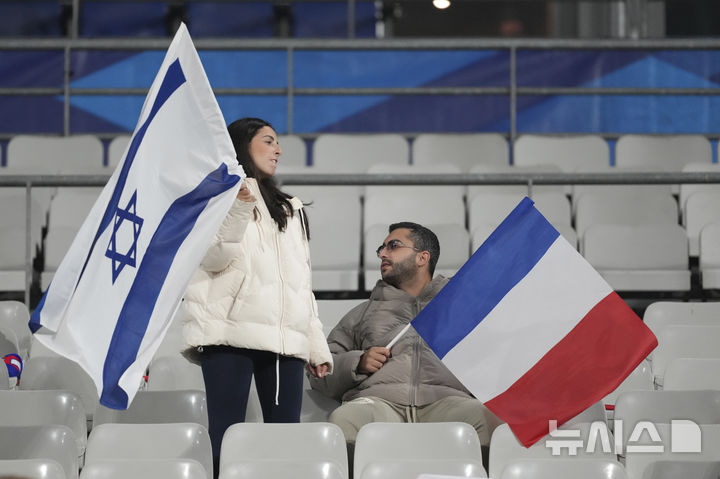 [생드니=AP/뉴시스] 이스라엘 축구팬(왼쪽)과 프랑스 축구팬이 14일(현지시각) 프랑스 파리 외곽 생드니의 스타드 드 프랑스에서 열린 2024-25 유럽축구연맹(UEFA) 네이션스리그 리그A 2조 5차전 프랑스와 이스라엘의 경기 시작을 기다리고 있다. 경기는 0-0 무승부로 끝나 프랑스가 조 2위를 확보해 8강 진출을 확정했다. 이날 경기장 밖에서는 팔레스타인 깃발을 든 시위대가 학살범과는 이스라엘을 규탄하기도 했다. 2024.11.15.