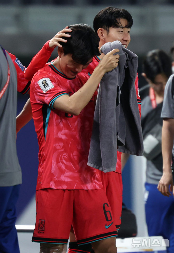 [쿠웨이트시티(쿠웨이트)=뉴시스] 이영환 기자 = 14일 오후(현지시각) 쿠웨이트 자베르 알아흐마드 국제경기장에서 열린 2026 국제축구연맹(FIFA) 북중미 월드컵 아시아 3차 예선 B조 5차전 한국과 쿠웨이트의 경기, 3-1로 승리한 한국 손흥민이 황인범의 머리를 만지고 있다. 2024.11.15. [email protected]