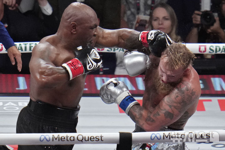 [알링턴=AP/뉴시스] 마이크 타이슨(왼쪽)과 제이크 폴이 15일(현지시각) 미 텍사스주 알링턴의 AT&T 스타디움에서 열린 프로복싱 헤비급 경기를 펼치고 있다. 폴이 3-0 판정승을 거두고 대전료 약 558억 원을 받는다. 이 경기는 2분 8라운드로 진행됐으며 정식 프로 복싱 경기로 인정된다. 2024.11.16.