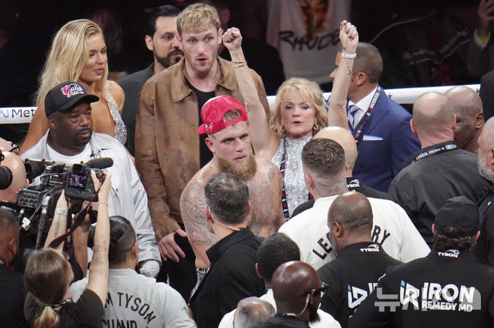 [알링턴=AP/뉴시스] 제이크 폴이 15일(현지시각) 미 텍사스주 알링턴의 AT&T 스타디움에서 열린 프로복싱 헤비급 경기에서 마이크 타이슨을 3-0 판정으로 물리친 후 그의 어머니 팸 스텝닉이 옆에서 환호하고 있다. 이 경기는 2분 8라운드로 진행됐으며 정식 프로 복싱 경기로 인정된다. 2024.11.16.