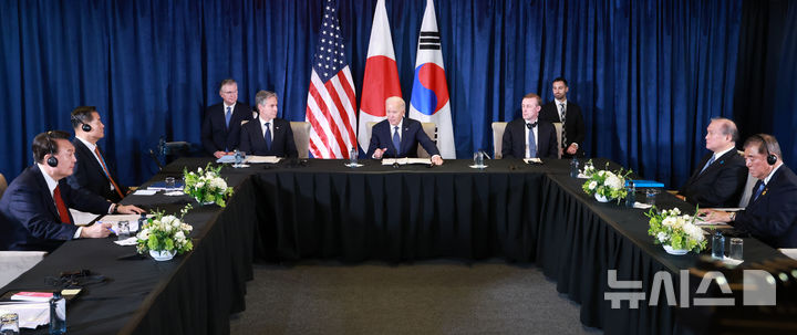 [리마=뉴시스] 조수정 기자 = 아시아태평양경제협력체(APEC) 정상회의 참석차 페루를 방문 중인 윤석열 대통령이 15일(현지시간) 페루 리마 컨벤션센터에서 조 바이든 미국 대통령, 이시바 시게루 일본 총리와 한미일 정상회의를 하고 있다. 2024.11.16. [email protected]