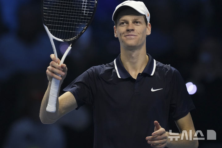 [토리노=AP/뉴시스] 얀니크 신네르(1위·이탈리아)가 16일(현지시각) 이탈리아 토리노의 이날피 아레나에서 열린 남자프로테니스(ATP) 투어 파이널스 단식 4강전에서 카스페르 루드(7위·노르웨이)를 꺾은 후 세리머니하고 있다. 신네르가 2-0(6-1 6-2)으로 승리하고 결승에 올라 테일러 프리츠(5위·미국)와 우승을 다툰다. 2024.11.17.