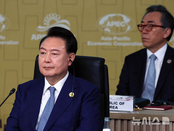 [리마=뉴시스] 조수정 기자 = 윤석열 대통령이 16일(현지시각) 페루 리마 컨벤션센터에서 열린 아시아태평양경제협력체(APEC) 정상회의 세션2 리트리트에 참석하고 있다. 오른쪽 뒤는 조태열 외교부 장관. 2024.11.17. [email protected]