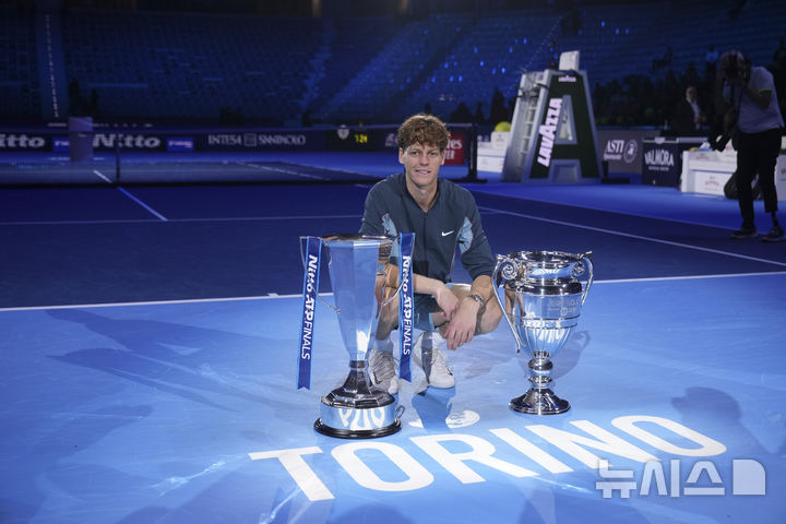 [토리노=AP/뉴시스] 얀니크 신네르(1위·이탈리아)가 17일(현지시각) 이탈리아 토리노에서 열린 남자프로테니스(ATP) 투어 파이널스 단식 정상에 올라 우승컵과 세계 1위 트로피를 놓고 기념 촬영하고 있다. 신네르는 결승에서 테일러 프리츠(5위·미국)를 2-0(6-4 6-4)으로 완파하고 이탈리아 출신으로는 처음으로 이 대회 우승을 차지했다. 2024.11.18.