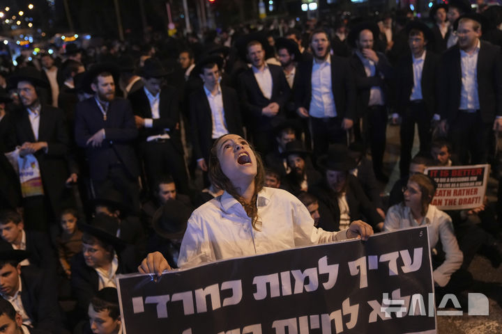 [브네이브라크=AP/뉴시스] 17일(현지시각) 이스라엘 텔아비브의 브네이브라크에서 유대교 초정통파 '하레디' 교도들이 징집에 반대하며 도로를 막고 시위하고 있다. 이스라엘 카츠 이스라엘 국방장관은 지난 15일 하레디 7천 명에 대해 입영 명령을 승인했고 국방부는 이 중 1천 명에게 입영 영장을 보냈다. 2024.11.18.
