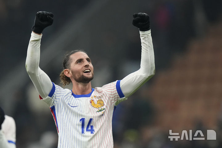 [밀라노=AP/뉴시스] 프랑스의 아드리앵 라비오가 17일(현지시각) 이탈리아 밀라노의 스타디오 산시로에서 열린 2024-25 유럽축구연맹(UEFA) 네이션스리그 리그A 2조 6차전 이탈리아와 경기를 승리로 마친 후 인사하고 있다. 이미 8강 진출을 확정한 프랑스는 라비오의 멀티 골 등을 묶어 3-1로 승리하고 조 1위를 기록했다. 2024.11.18.