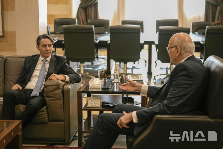 [베이루트=AP/뉴시스] 조 바이든 미국 대통령의 중동 특사인 아모스 호치스타인 백악관 선임고문이 19일(현지시각) 레바논을 방문한다. 사진은 지난달 21일 레바논 베이루트에서 호치스타인 특사가 나지브 미카티 레바논 총리(오른쪽)와 만나 대화하는 모습. 2024.11.19.