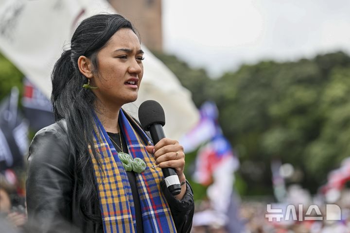 [웰링턴=AP/뉴시스] 뉴질랜드 마오리당의 하나-라휘티 마이키-클라크 의원이 19일(현지시각) 웰링턴 의회 밖에서 열린 '와이탕이 조약' 재해석 법안 반대 시위에 참석해 연설하고 있다. '와이탕이 조약'은 영국과 마오리족이 1840년 맺은 조약으로 영국이 마오리족을 통치하는 대가로 마오리족에게 일정한 토지와 문화적 권리를 보장한다는 내용이다. 최근 우익 ACT당에서 이 조약이 다른 뉴질랜드인에게 차별이라며 조약을 재해석해야 한다는 주장을 제기해 마오리족을 중심으로 반발이 커지고 있다. 2024.11.19.