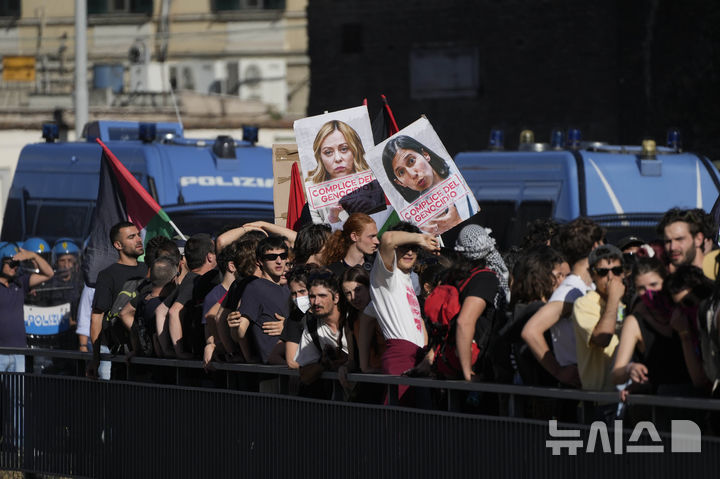 [로마(이탈리아)=AP/뉴시스]지난 6월1일 로마에서 열린 반정부 시위에서 시위대가 '대량학살을 공모했다'고 쓰인 현수막과 함께 조르자 멜로니 이탈리아 총리(왼쪽)와 엘리 슐린 민주당 대표의 사진을 들고 시위를 벌이고 있다. 조르자 멜로니 이탈리아 총리가 18일 치러진 지방선거 2곳에서 모두 패배한 것으로 19일 나타났다. 2024.11.19.