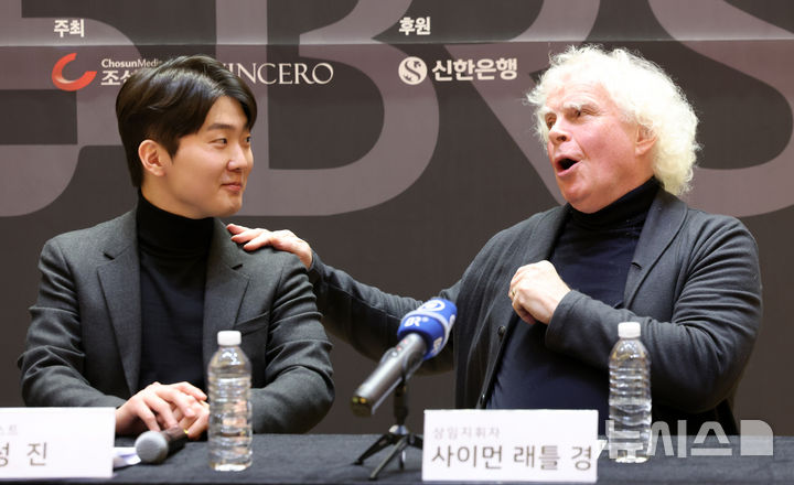 [서울=뉴시스] 박진희 기자 = 바이에른 방송교향악단(BRSO) 상임 지휘자 사이먼 래틀 경(Sir Simon Rattle)과 피아니스트 조성진이 19일 서울 송파구 롯데콘서트홀 리허설룸에서 바이에른 방송교향악단 아시아투어 기자간담회를 하고 있다. 올해 75주년을 맞은 바이에른 방송교향악단 오는 20일, 21일 양일간 롯데콘서트홀에서 협연자 조성진과 함께 내한공연을 한다. 2024.11.19. [email protected]